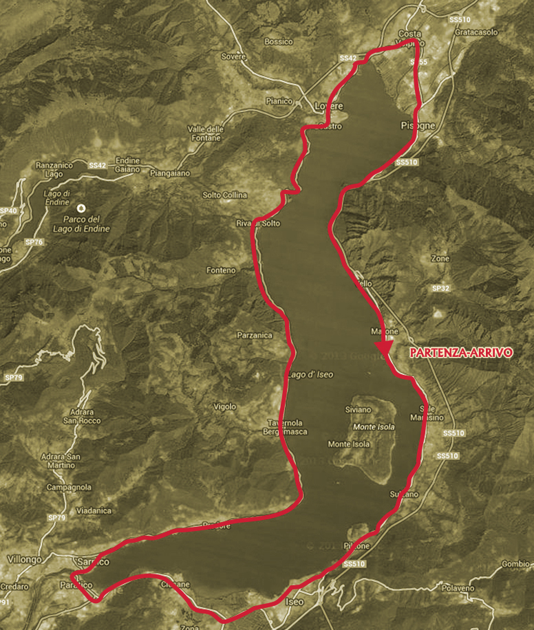 Il percorso pianeggiante di 65 km circa percorrerà il giro del lago d'Iseo passando nell'ordine per i comuni di : Marone - Sale Marasino - Sulzano - Iseo - Clusane - Paratico - Sarnico - Predore - Tavernola Bergamasca - Parzanica - Riva di Solto - Castro - Lovere - Costa Volpino - Pisogne - Marone.